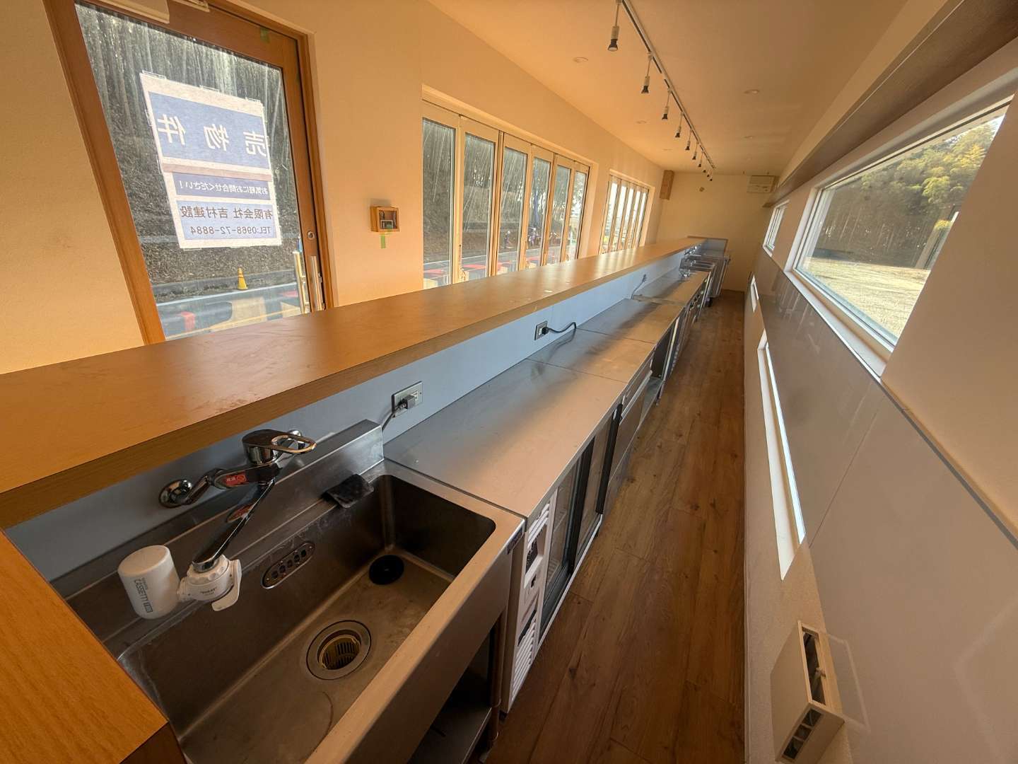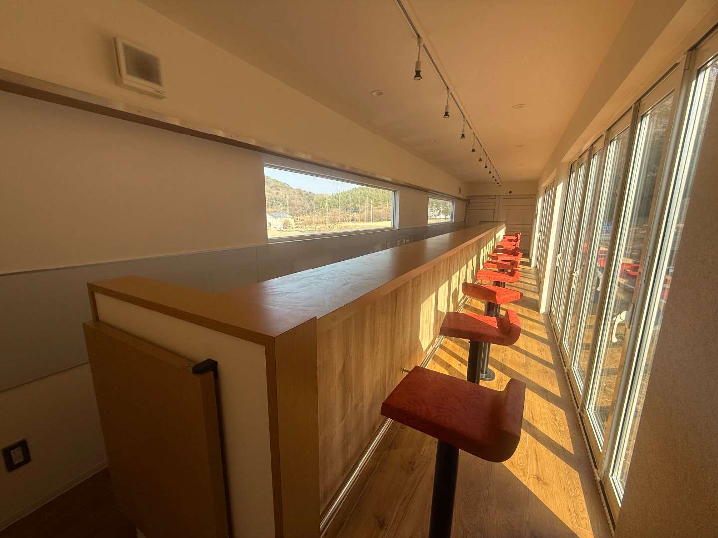 室内は、木の温もりを感じるロングカウンターが印象的なバースタイル。一直線に伸びたカウンターは存在感があり、しっかり12席を確保しています。お客様との距離が近く、会話を楽しめる空間づくりができるレイアウトです。バー営業はもちろん、カフェや軽飲食、テイクアウト併設型の店舗としても活用可能です。